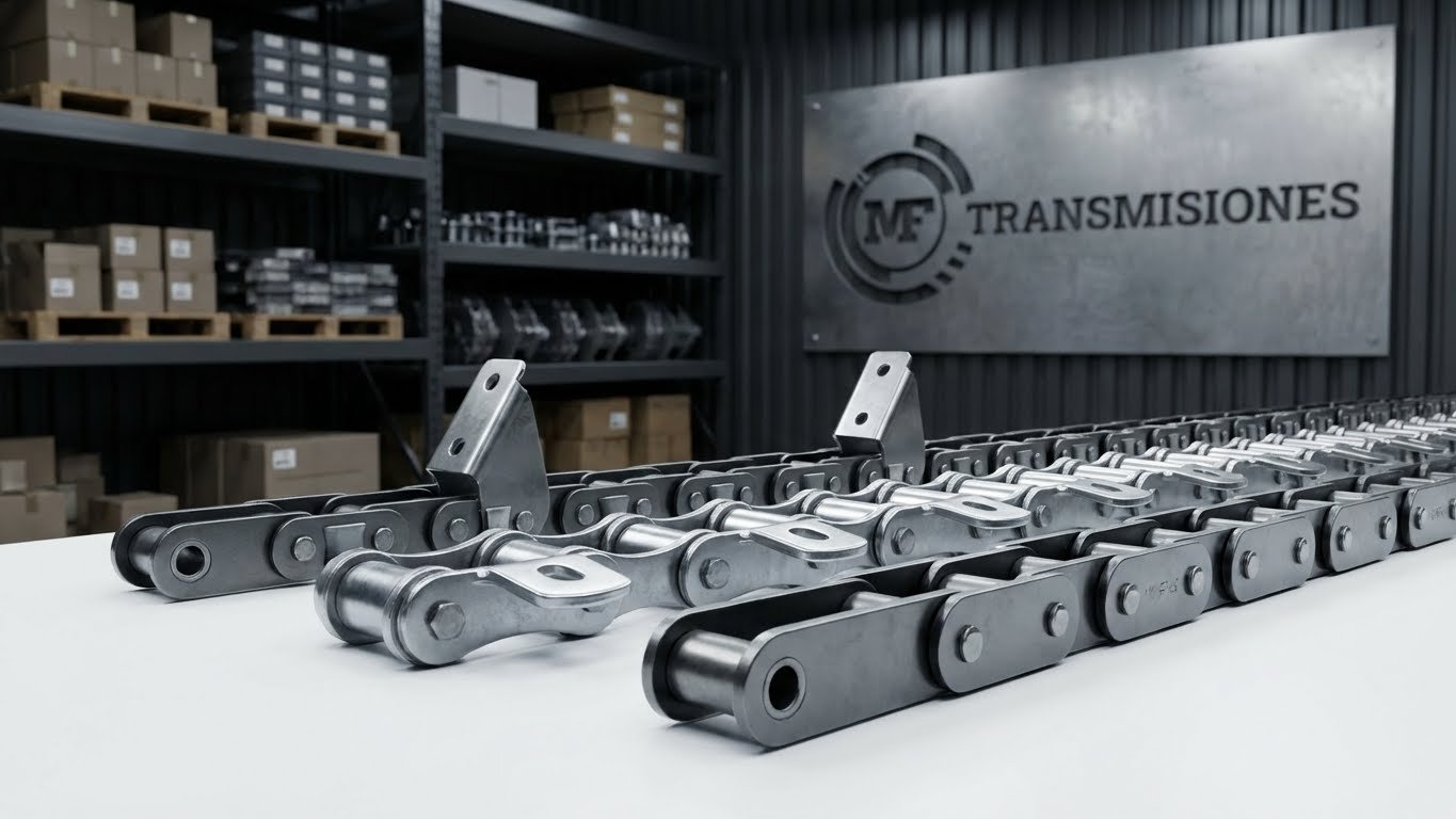 Cadena de transporte con aditamentos tipo K (aletas verticales) o M (aletas horizontales). Ideales para sistemas de elevación y arrastre en hornos y líneas de pintura, entre otros usos. ¿Repuesto difícil? Envianos una foto de la aleta y la medida del paso. Nosotros identificamos la norma y te cotizamos la cadena de reemplazo.
